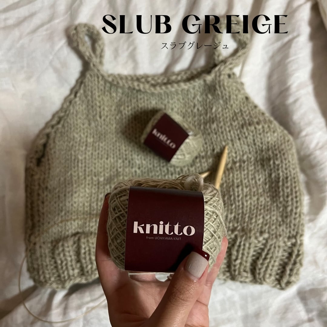“スラブグレージュ”は、糸の太さに変化があるスラブ糸の特性を活かしたナチュラルなグレージュ。マットで落ち着いた色合いと、凹凸が生み出す立体感が特徴です。シンプルな編み地も表情豊かに仕上げてくれるので、日常に馴染む上質な作品づくりに最適です。